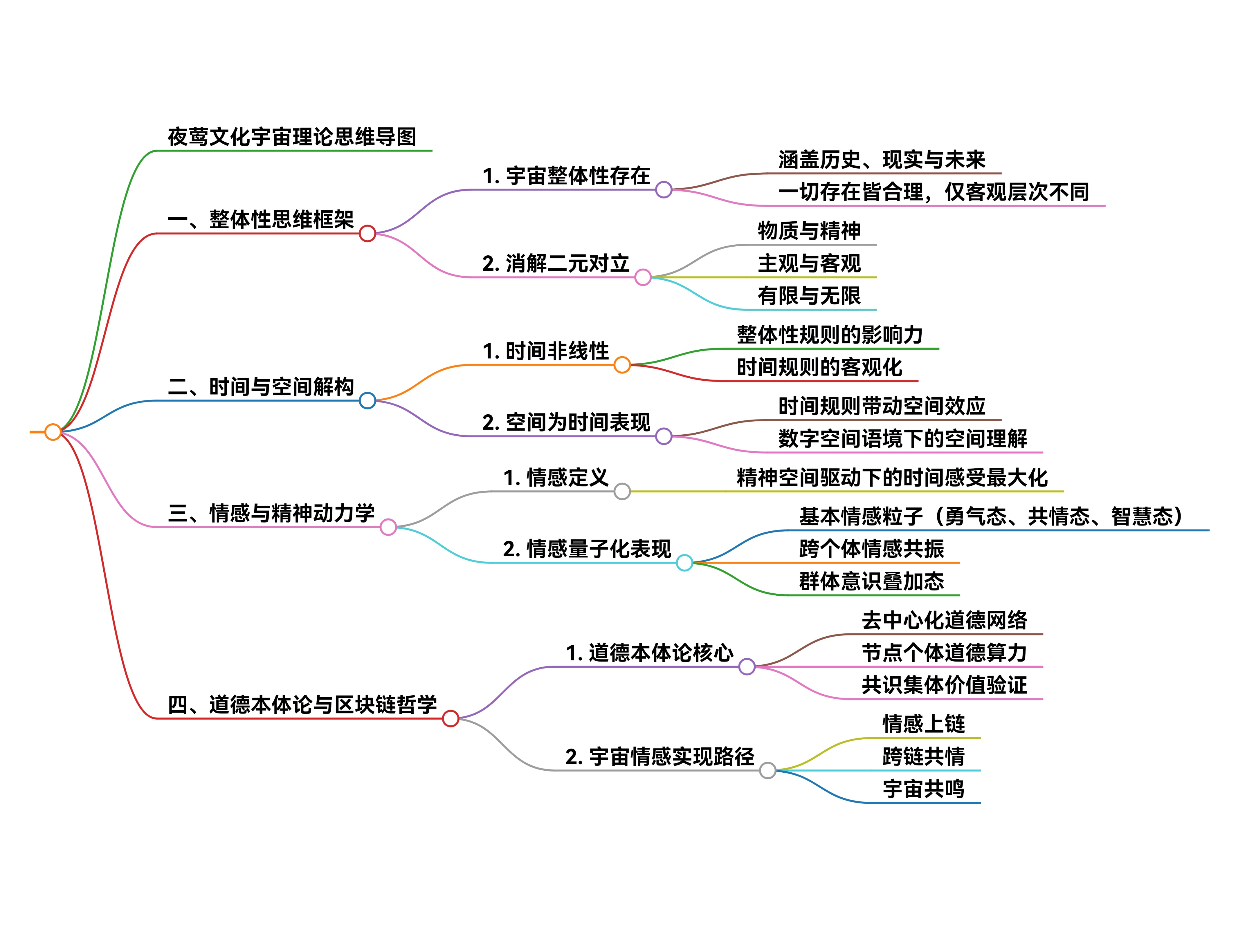 以上理论涉及夜莺文化的生命与生命形式、时间与空间、历史与现实、思维与存在、客观节点与时间节点、非理性与理性以及道德本体论等哲学理论,仅此概括论述可能无法清晰表达物质宇宙、生命宇宙、精神宇宙这样的整体性问题。