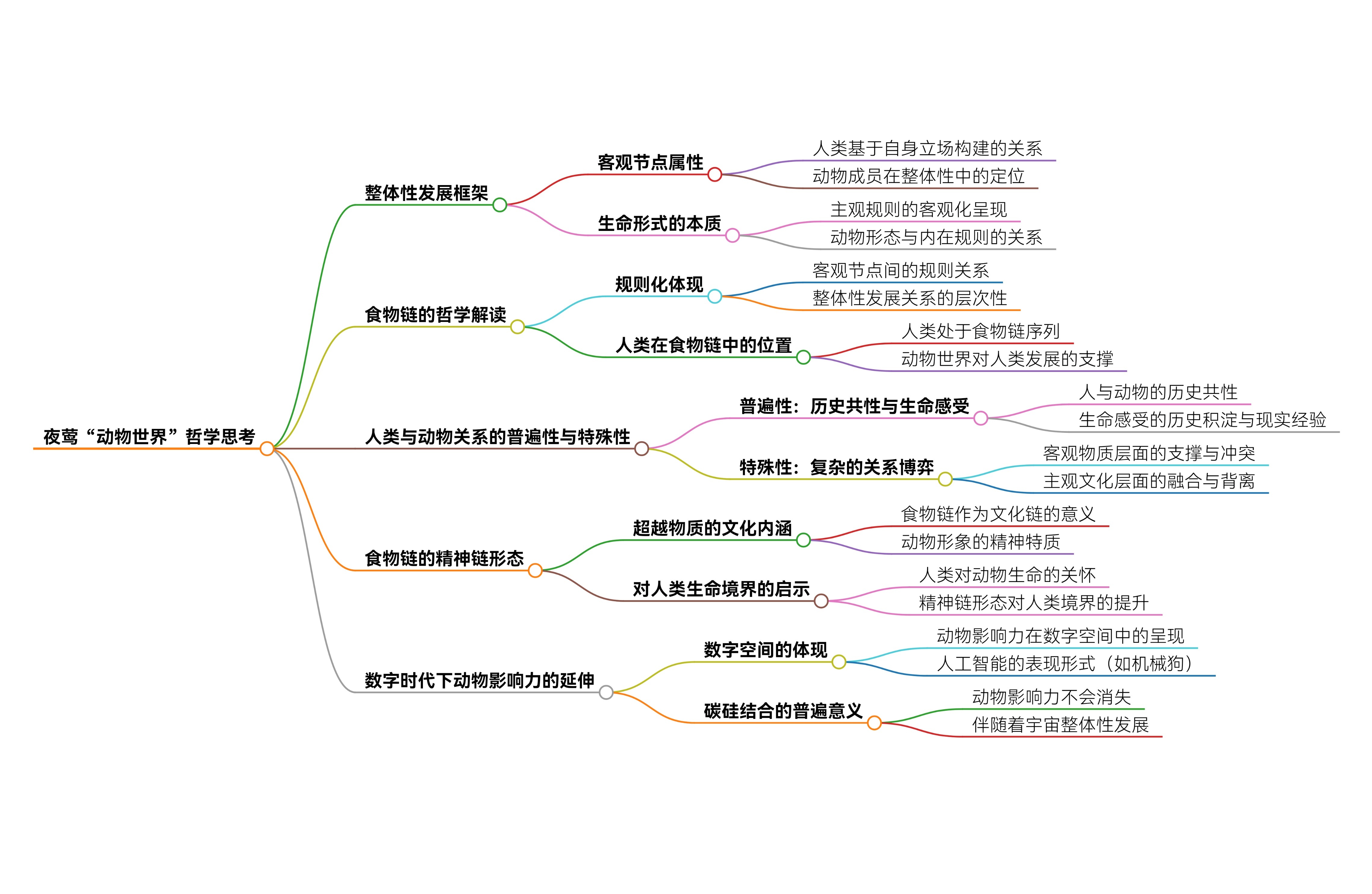 • 对人类生命境界的启示:人类对动物生命的关怀与珍惜体现了人类的生命境界,而食物链的精神链形态进一步强调了人类与动物在精神层面的联系。这启示我们要尊重每一个生命,从动物世界中汲取智慧和力量,不断提升自己的生命境界。