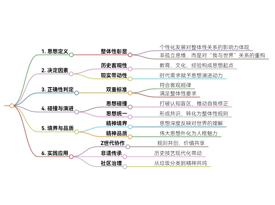 • 思想统一是集体行动的前提:当个性化思想经过碰撞后形成共识,就会转化为整体性发展的规则。例如环保理念从个体呼吁演变为社会共识,最终推动相关政策落地,完成从“思想”到“现实带动性”的闭环。