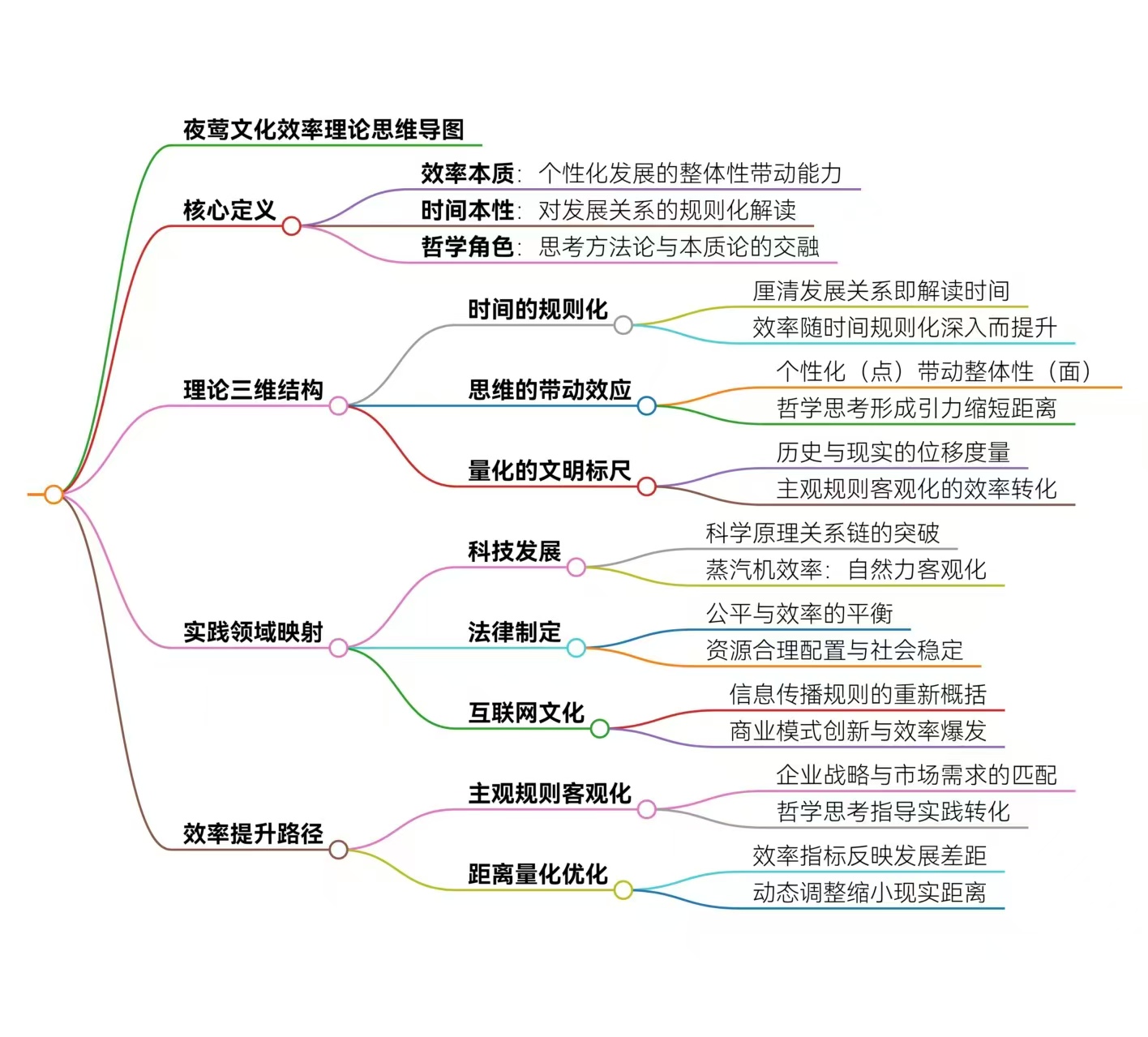 • 创新点:它将效率视为一种空间度量。如果一个主观规则能迅速客观化(如法律的普及、算法的开源),它就缩小了人类文明历史与未来预期之间的距离。这种视角将效率与文明的演进挂钩,使效率从一个冷冰冰的数学指标变成了具有温情和导向性的发展标尺。