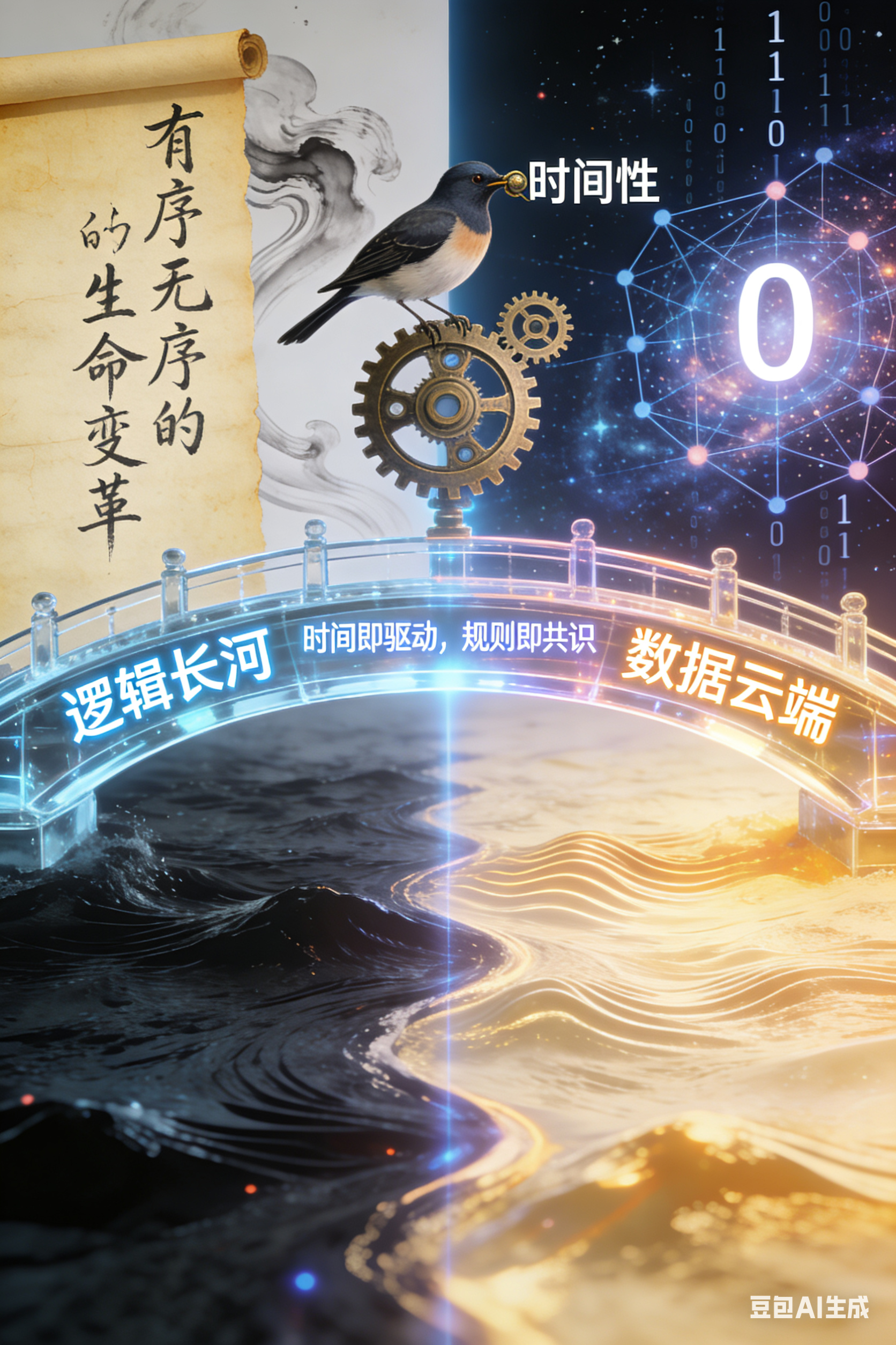 3. 连接纽带(创新内核):桥身中央嵌入一行微光文字——“时间即驱动,规则即共识”,点明了理论的三大创新支柱。