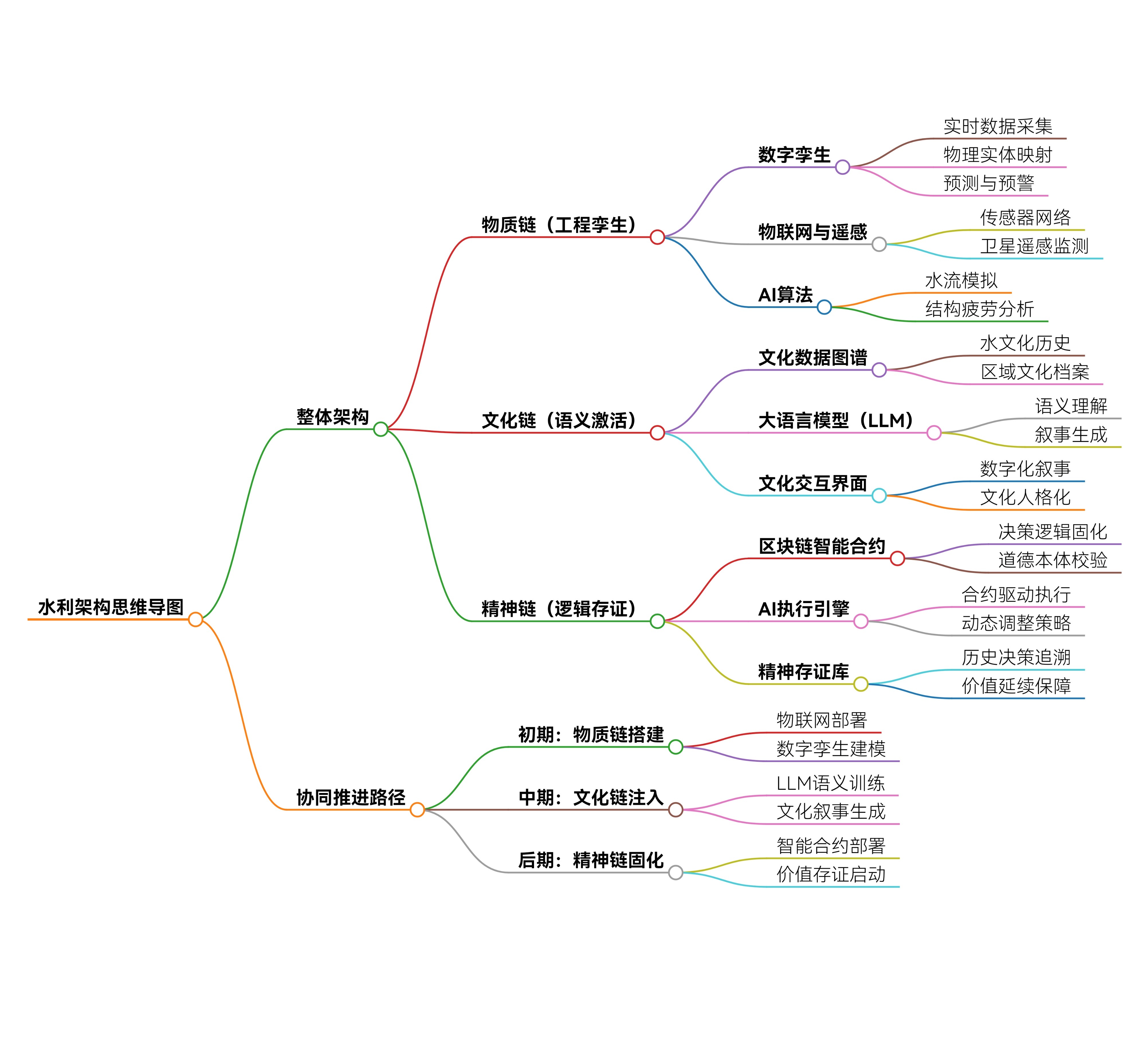 2. “三链融合”的螺旋式演进模型该架构打破了物质与精神的二元对立,构建了物质链(根基)—文化链(纽带)—精神链(灵魂)的协同体系。这种“三位一体”的逻辑与现代国家创新体系中的“三元并行交互”结构有异曲同工之妙,但在水利领域属于首次将“哲学价值”作为顶层逻辑介入技术架构。