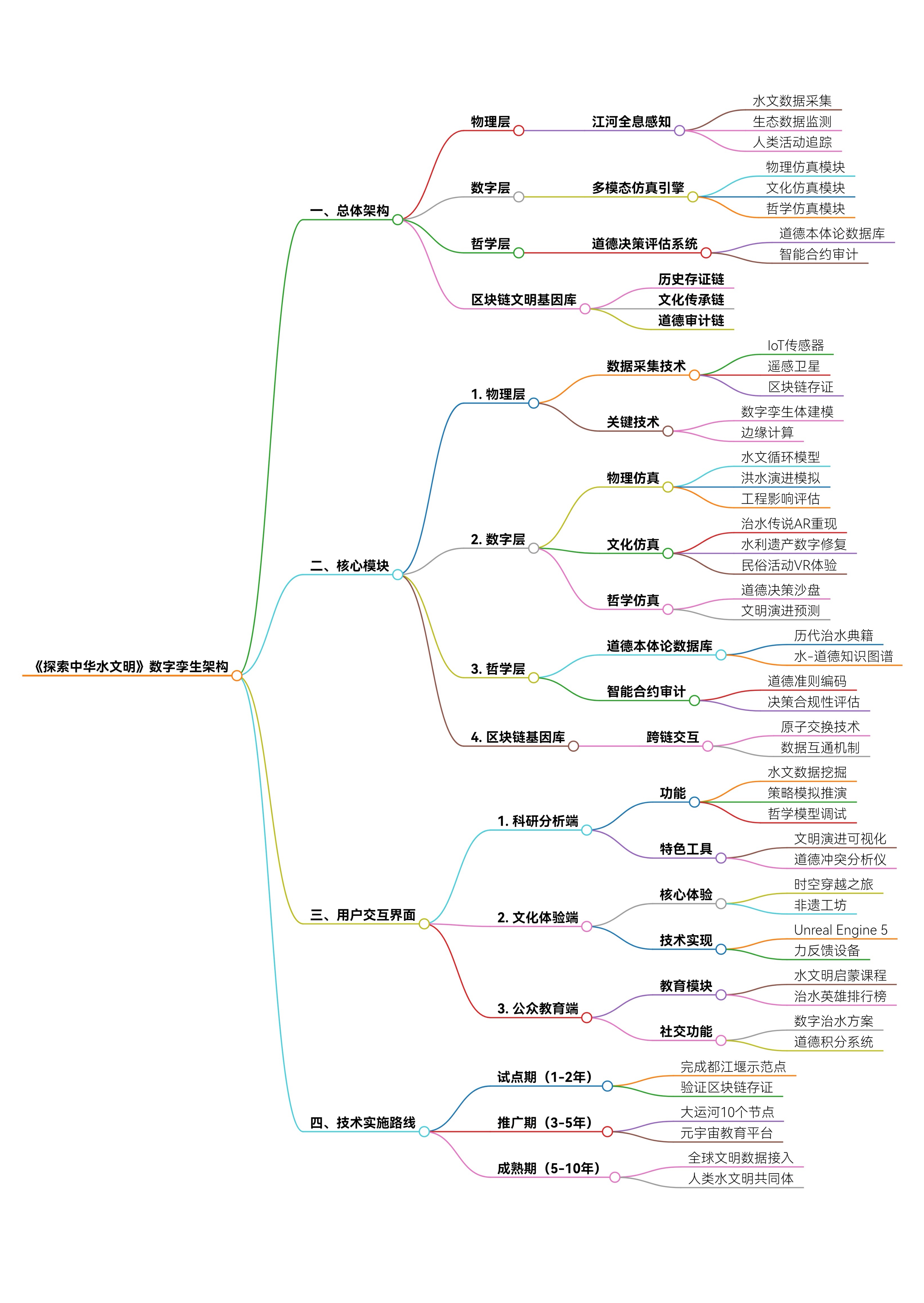┌───────────────────────────────────────────────────────┐│ 《探索中华水文明》数字孪生架构 │├───────────────┬───────────────┬───────────────┤│ 物理层(江河)│ 数字层(孪生)│ 哲学层(伦理)│└───────────────┴───────────────┴───────────────┘ │ │ │ ▼ ▼ ▼┌───────────────────────────────────────────────────────┐│ 数据感知网络 │ 多模态仿真引擎 │ 道德决策评估系统 ││ (IoT+遥感) │ (物理/文化/哲学模型)│ (基于道德本体论) │└───────────────┬───────────────┬───────────────┘ ▼ ▼┌───────────────────────────────────────────────────────┐│ 区块链文明基因库 ││ ┌───────────┐ ┌───────────┐ ┌───────────┐ ││ │ 历史存证链│ │ 文化传承链│ │ 道德审计链│ ││ └───────────┘ └───────────┘ └───────────┘ │└───────────────────────────────────────────────────────┘ │ ▼┌───────────────────────────────────────────────────────┐│ 用户交互界面 ││ ┌───────────┐ ┌───────────┐ ┌───────────┐ ││ │ 科研分析端│ │ 文化体验端│ │ 公众教育端│ ││ └───────────┘ └───────────┘ └───────────┘ │└───────────────────────────────────────────────────────┘
